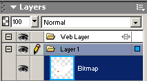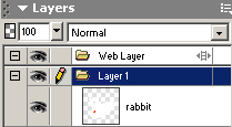 當轉變完成後我們可以發現,layer面板中兔子的屬性已經變成位圖了。這時我們可以給該對象層建個名稱了,比如rabbit。原來在fw4中我們給對象層改名是直接雙擊layer面板裡的名字,然後填寫新的名稱;在fwmx中除了可以象fw4那樣做以外,還有一種更便捷的方法,直接在propertIEs面板裡填寫,如下列圖所示: