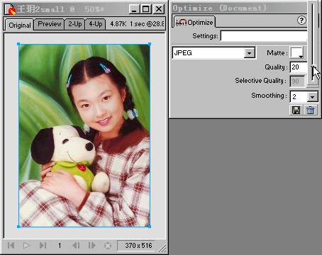 具體的設置是在Optimize面板的Settings下拉菜單中選擇JPEG - Smaller File,然後再將Quality設置為20以便獲得比預置JPEG - Smaller File更大的壓縮比。