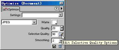 如果你在這裡輸入了一個比在Optimize面板的Quality域中更小的值,則被選擇區域的壓縮比將比圖像中的其他區域更大而畫質也會更差;如果你在這裡輸入了一個比在Optimize面板的Quality域中更大的值,則被選擇區域的壓縮比將比圖像中的其他區域更小而畫質也會更好。