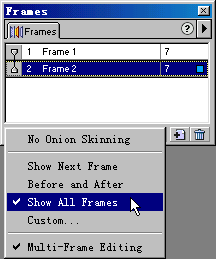 在放置好用於交換的圖像後,你可以再次點擊Frames面板中的Onion Skinning(洋蔥皮)按鈕,在彈出的菜單中選擇No Onion Skinning(沒有洋蔥皮),以避免各種各樣的透明圖像混淆了你的視覺。