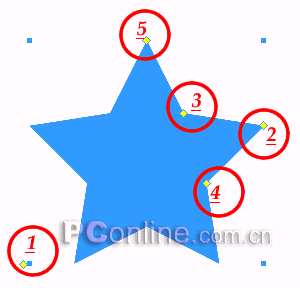 3、通過前面的學習我們知道,目前編輯區繪制的星形對象共有5個調整控制點,我們可以通過調整這5個控制點來進行進一步的編輯操作。為了便於隨後的敘述,我們同樣是將星形對象的幾個控制點進行編號。如下圖所示: