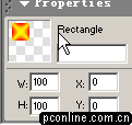 3、選取工具箱的矩形繪制工具,在編輯區繪制一個任意大小的矩形,然後在PropertIEs(屬性)面板上的Info區域進行具體設置,將W(寬)、H(高)值均設為100,將X、Y值均設為0,這樣,我們就得到了一個位於編輯區左上角、邊長為100像素大小的正方形。具體設置如下圖所示: