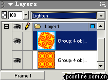 8、選定編輯區的組合對象,執行菜單命令"Edit / Clone",原地克隆復制一個組合對象,接著執行菜單命令"Modify / Transform / Numeric Transform",在彈出的對話框中選擇變形方式為Rotate(旋轉),輸入旋轉的數值大小為"30",其余不作調整,點擊確定即可,這樣就將克隆對象順時針方向旋轉了10度,打開層面板我們可以看到目前編輯區兩個對象的位置關系。選中克隆的對象所在的層,單擊混合模式的下拉菜單,選擇混合模式為Lighten(加亮),如下圖所示: