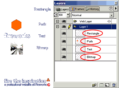 矩形/路徑/文本具有矢量圖形的特性,可以任意的放大、縮小,同時他們都可以轉換成位圖(選擇Modify->Convert to Bitmap),但是一旦轉換成位圖就不能轉換回來。在Fireworks4中,每個對象都會擁有一個自己的子層,子層之上是父層(關於層的詳細介紹請查看與層相關的章節)每個層都標明了這個對象的類型,它可以在Layer面板中看出來,如圖: