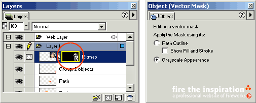 遮罩被創建之後就可以根據需要改變它的屬性。要修改一個遮罩時,先在Layers面版(Window->Layers)中點擊那一層中遮罩的部分選中它。當遮罩被選中後,Object面版(Window->Object)中就會出現相關的參數。
