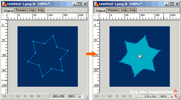 如果這些工具不能滿足你對熱區形狀精確控制的要求,那麼我們還有其他的方法。例如我們要建立一個星型的熱區,我們可以這樣做:首先,在畫板上繪制一個預想中的星型,使用多邊型工具(Polygon Tool)應該非常容易做到這一點,然後選擇Insert->Hotspot,Fireworks就會根據這個多邊形的路徑創建一個形狀和大小相同的熱區(注意:Fireworks是新創建了一個熱區對象,而不是轉換這個路徑,因此原來的多邊形仍舊存在),完成之後就可以把一開始的那個多邊形刪除掉了。