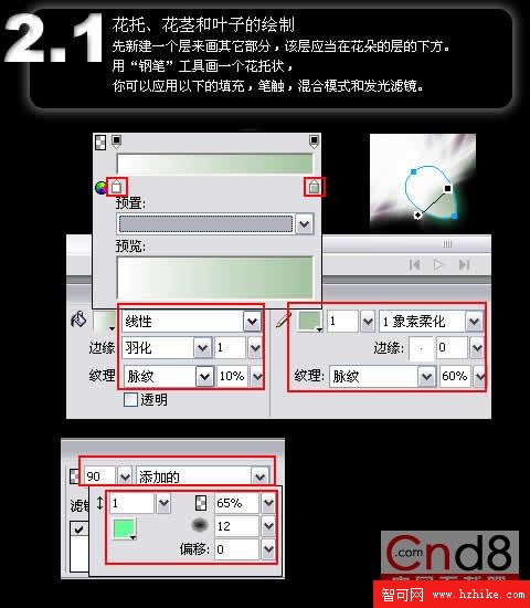 2.2用鋼筆繪畫一個無填充的路徑作為花莖。參數如圖。“發光”濾鏡參數和花托相同。
