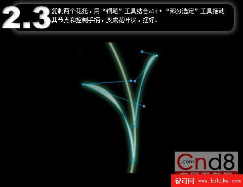 2.3復制兩個花托,用“鋼筆”工具結合alt+“部分選定”工具拖動其節點和控制手柄,變成花葉狀,擺好。