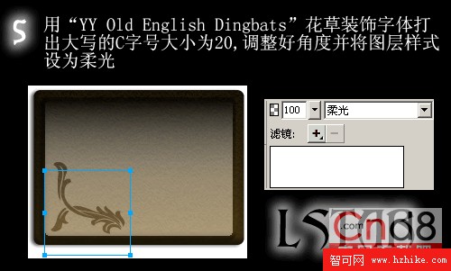 5.用“YY Old English Dingbats”花草裝飾字體打出大寫的C,字號大小為20,調整好角度並將圖層式樣設為柔光。