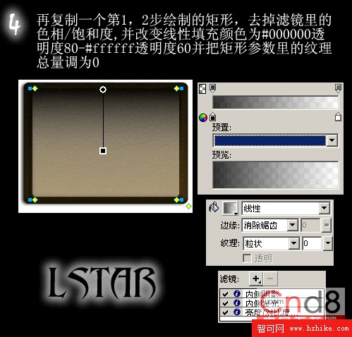 4.再復制一個第一、二步繪制的矩形,去掉濾鏡裡的色相/ 飽和度,並改變線性填充顏色為#000000 透明度80-#ffffff 透明度60,並把矩形參數裡的紋理總量調為0。
