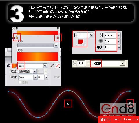 3. 對路徑去除“筆觸”,進行“條狀”漸變的填充。手柄調節如圖。加一個發光濾鏡。混合模式選“添加的”。