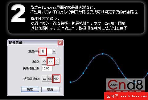 2. 雖然在firework裡面筆觸是沒有漸變的,不過可以用如下的方法令到開放路徑變成可以填充漸變的閉合路徑選中剛才的路徑,執行“修改-改變路徑-擴展筆觸”,寬度:2px角:圓角其他如圖所示,按“確定”,路徑現在就可以填充漸變色了