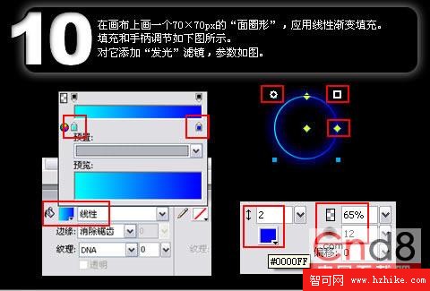 填充和手柄調節如下圖所示。對它添加“發光”濾鏡,參數如圖。