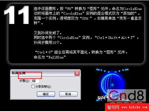 又到補間發威了。同時選中兩個“CircleBlue”實例,“Ctrl+Shift+Alt+T”,補間步驟用10個。