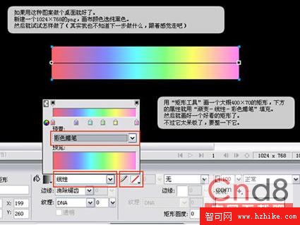 用“矩形工具”畫一個大概400*70的矩形,下方的屬性就用“漸變—線性—彩色蠟筆”填充。然後就畫好一個好看的矩形了。不過它太呆板了,要整一下它。
