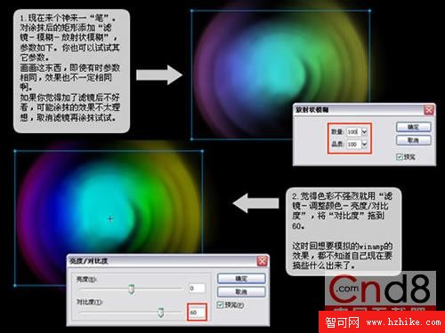 現在來個神來一“筆”。對塗抹後的矩形添加“濾鏡—模糊—放射狀模糊”,參數如下。你也可以試試其它參數。