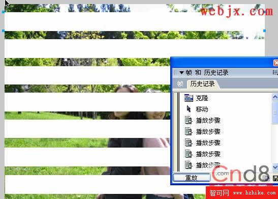 選中這個矩形,克隆(ctrl+shift+D),並移動至合適的位置。回到歷史記錄面板,全選歷史記錄裡這些步聚,再單擊重放按紐,如圖所示:
