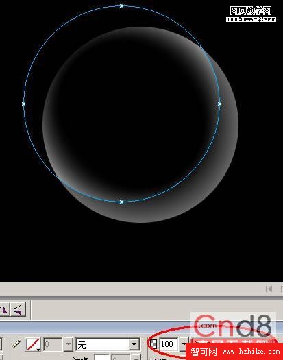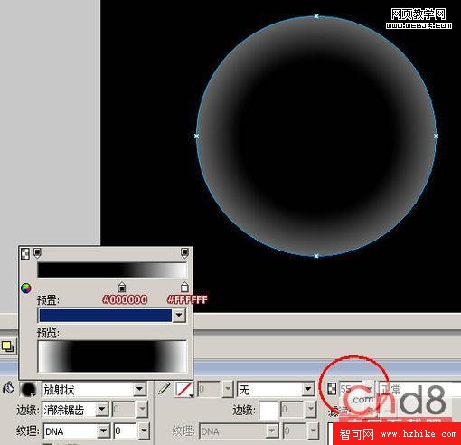 啟動Fireworks -> 將背景調成“黑色”,在畫布中畫一個圓。