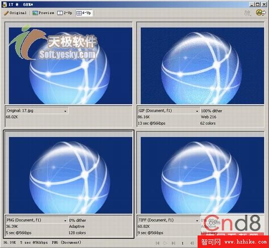 只有通過比較鑒別才能突出不同圖像格式的色彩和大小等特點,為此,我們首先講一講如何在導出時對不同格式進行選擇。Fireworks裡提供了在線比較不同的優化方式和原圖的效果的窗口,2-up模式和4-up模式。若比較一幅圖像的GIF導出效果與原圖的差別,可以使用2-up模式和4-up模式。若比較一幅GIF導出效果與原圖的差別,可以使用2-up模式。若希望比較兩三種格式或優化方式的優劣時,就可選擇4-up模式。圖1顯示了原圖與GIF、PNG和TIFF三種格式的導出圖像的差異,同時窗口中還顯示了每一種優化方式或格式的主要參數、圖像大小和傳輸時間等信息,可以幫助用戶在不同圖像格式之間的選擇。