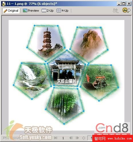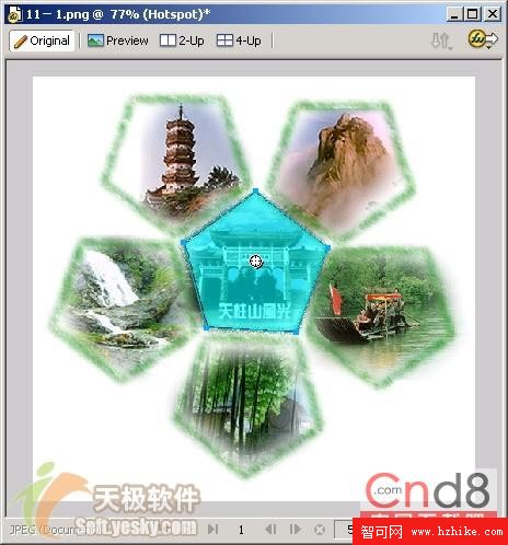 如果選擇多個對象,如圖6所示,我們選擇天柱山風光圖的六幅小圖的邊界路徑,接著選擇“Edit”菜單下的“Insert”->“Hotspot”,這時候會跳出圖7所示的對話框,我們選擇“多重”按鈕,這樣就為所有的小圖像添加上了熱區了,如圖8所示。