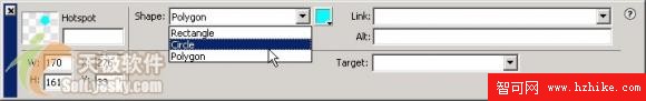 選中熱區之後,利用指針工具或者次選擇工具拖動熱區邊框上的控制點可以改變熱區的形狀。對於矩形熱區和圓形熱區,我們只能通過控制點改變大小而不能改變形狀。如果我們需要將一種形狀的熱區變為另一種形狀的熱區,只需要在選中需要改變形狀的熱區之後,在其屬性面板中“Shape”下拉列表中選擇需要的形狀即可,如圖10所示。