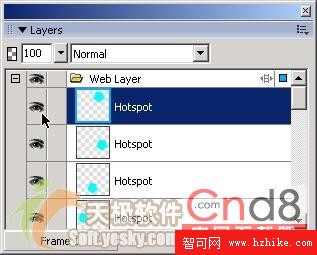 另外,我們還可以利用層面板來顯示和隱藏熱區。點擊層面板的熱點前的眼睛圖標(如圖11所示)就可以隱藏該熱區。隱藏了熱區之後,再次點擊該區域,眼睛圖標又顯示出來了,這樣所選熱區也重新顯示出來了。