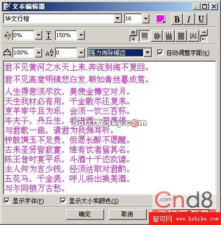 3) 再用文本工具書寫俠客行的詩詞內容,注意行文順序從右到左,顏色為紫色,字號為16,其他設置如圖2所示。
