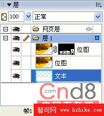 8、選中位於上層的文本對象,按“Ctrl+X”鍵,剪切它,選中位於上層的位圖對象,選擇菜單命令“修改|蒙版|粘貼為蒙版”,在編輯區上此時看不出有任何變化,但是層面板上已經發生變化了。選中剩下的文本對象,將其拖動到層面板的最下層,此刻層面板的對象排列應該如下圖所示。