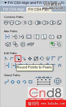 我們不能用Stroke去給矩形加外邊框,因為虛邊會把你給搞死。如果你用Rounded Rectangle工具畫出來的圓角矩形已經出現了非Stroke虛邊,那就把節點打散後,用黑色箭頭工具選中那個Path,點擊路徑面板的Round Points to Pixels把路徑的所有節點歸位到像素交點(也可以用白色箭頭工具選中某個節點單獨進行歸位)。