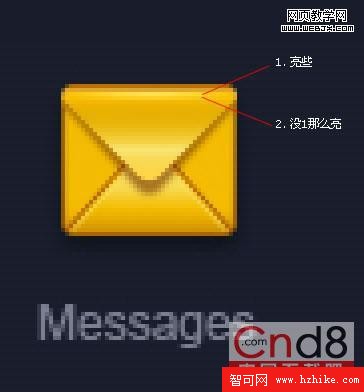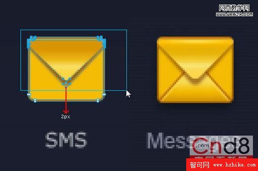 用白色箭頭選中途中所示那些節點,然後用鍵盤的方向鍵往下挪兩個像素,這樣使信封看起來長一點(因為這裡單個圖標不受整體風格約束)。