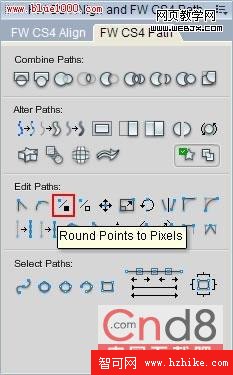 我們不能用Stroke去給矩形加外邊框,因為虛邊會把你給搞死。如果你用Rounded Rectangle工具畫出來的圓角矩形已經出現了非Stroke虛邊,那就把節點打散後,用黑色箭頭工具選中那個Path,點擊路徑面板的Round Points to Pixels把路徑的所有節點歸位到像素交點(也可以用白色箭頭工具選中某個節點單獨進行歸位)。