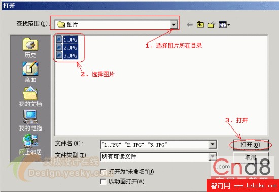 1、 運行Firework8,選擇“文件”——“打開”,在“查找范圍”選擇圖片所在的目錄,將選擇圖片,按“打開”。(見下圖1.jpg)