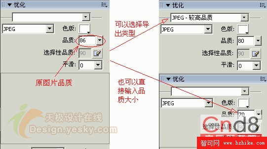 4、 調整圖片品質,圖片的品質越高,生成的圖片容量就越大,將圖片設成相對低一點品質,可以控制圖片容量的大小。點擊“優化”,可以看到這幅圖片的品質值是“86”,那麼我們在下拉菜單中選擇“JPEG-較高品質”,這時的“品質”值是“80”,當然您也可以直接在品質中輸入“70”。(見下圖3.jpg)