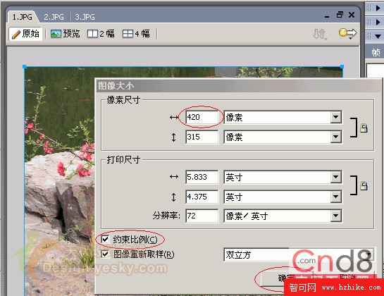 3、 調整圖片大小,選擇“修改”—“畫布”—“圖像大小”,“像素尺寸”寬設置成“420”像素,設成“約束比例”,按“確定”。(見下圖2.jpg)