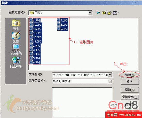 2、 出現“批次”對話框,選取所要調整的圖片,點擊“繼續”。(見下圖6.jpg)