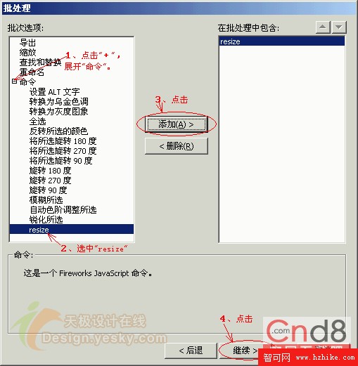 3、 出現“批處理”對話框,點擊“命令”前的“+”號,展開“命令”項,選取“resize”,點擊“添加”,再點擊“繼續”。(見下圖7.jpg)