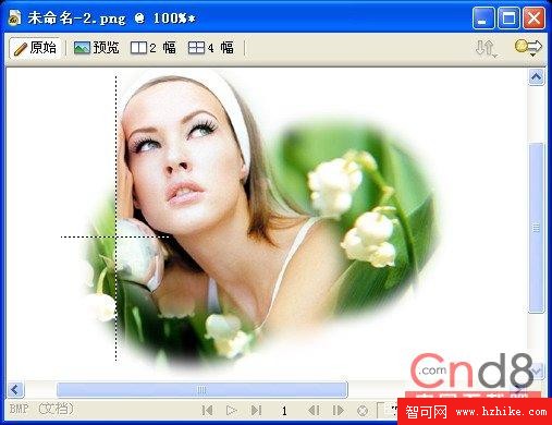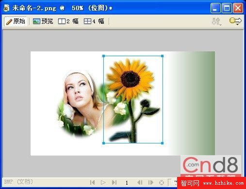 20.在Fireworks 8的新窗口中打開事先准備好的圖像素材“向日葵.jpg”,選擇繪圖工具欄中的【多邊形套索】工具,其屬性設置和前面一致,把向日葵選擇下來,並且復制到當前畫布中。如圖1.19所示。