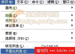 3.下面要先將文本平面化,即轉換為位圖,以便對其應用濾鏡效果。保持文本的選中狀態,選擇菜單命令“修改|平面化所選”,如圖4所示,或者按快捷鍵Ctrl+Alt+Shift+Z,即完成文本到位圖的轉換。