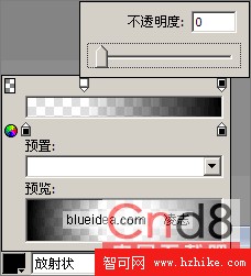 9、設定層2中的圓形為放射狀填充:左右兩側顏色均為黑色,將上方的不透明度選項做調整,將其中左側的不透明度選項稍向右移動,並將其值設置為0。
