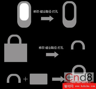1.畫一個圓角矩形,調節節點使弧度合適,克隆它,縮放合適的比例 ,移動,修改-組合路徑-打孔,然後繼續用矩形打孔掉下面的多余部分。再畫個圓角矩形,調整節點,作為鎖身。
