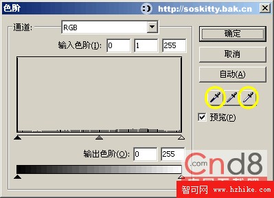 4、再次調節色階,這次需要利用“選擇陰影顏色”和“選擇高亮顏色”兩個小吸管調整黑白場,左面的吸管吸取的顏色為“黑場”(既:用它選中點的顏色以及比他更深的顏色都變為最深色(黑色)),同理,右面的吸管用來設置“白場”。