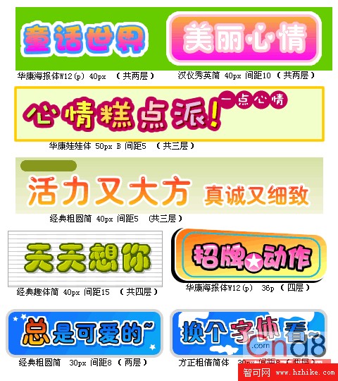 ·根據文字內容,加上相應的元素。如前面提到的“綠色”,除了用綠色文字等效果,還可以在文字的上角(左右都可)添上一片 ,或是把文字用帶水珠的綠色圖片來填充。其他自己發揮,總之創意無限。