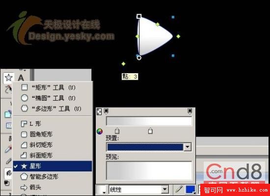 5、下面就是要畫中間的三角形,在這裡,可以選用多邊形工具畫出一個多邊形,然後調整多邊形的相關數值,根據效果自己調試三角形的細節,微軟的圖標中三角形是直邊的,但我這裡做了些變化,將其做成帶有弧度的邊,好象效果更獨特些,最後要將三角形進行漸變填充,上面是白顏色,下面可以是淺灰色:#CCCCCC,以白顏色為主。如圖