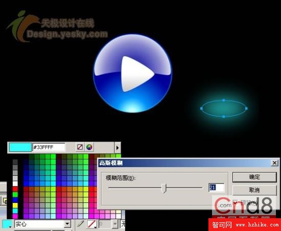 6、再有,為了增強圖標下半部的光感,還須畫出個淺藍色(#33FFFF)的橢圓,並且做高斯模糊效果,值可以選擇21,然後放置在圓的下部。如圖