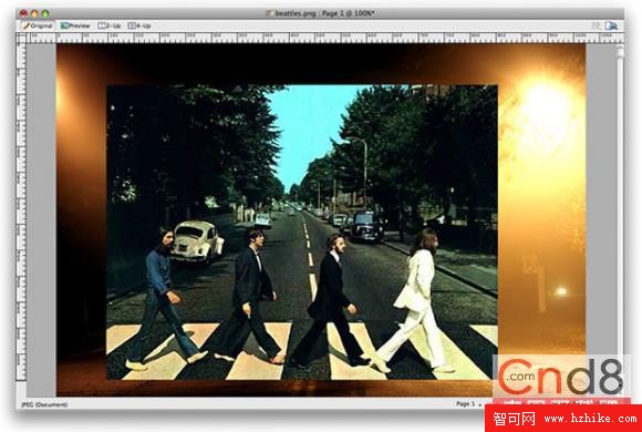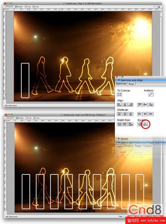 7,復制多次長方形斑馬線,隨後全選,進行變形,然後用之前做人物剪影同樣的方法來制作和背景融合的交通斑馬線效果