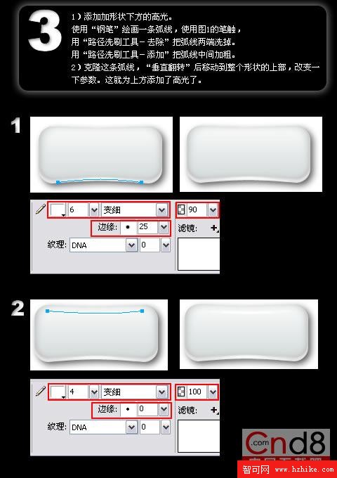 為形狀右方添加高光:使用“鋼筆”結合“部分選定工具”調節繪畫出如圖1的形狀,使用所示填充。