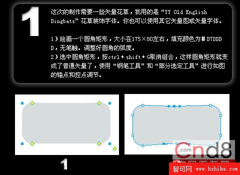選中圓角矩形,按ctrl+shift+G取消組合,這樣圓角矩形就變成了普通矢量了,使用“鋼筆工具”和“部分選定工具”進行如圖的錨點和控點調節。
