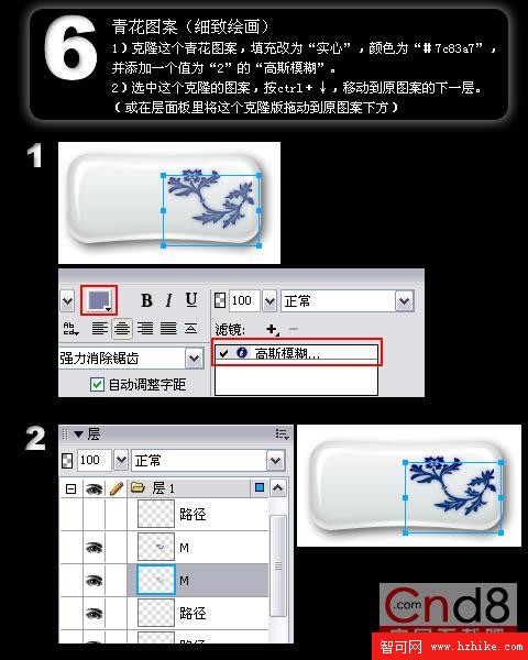 克隆這個青花圖案,填充改為“實心”,顏色為“#7c83a7”,並添加一個值為“2”的“高斯模糊”。