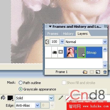 用工具欄上的次選取工具,就是那個空心小箭頭,到層面板上點選遮罩部分。大家可以看到黑色網點的矩形遮罩有個亮綠色的外框,表示已被選中。在屬性面板上,點選確認為“Grayscale Appearance/灰階表現”。