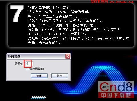 克隆一個“blue”實例,水平移動60個象素。同時選中兩個“blue”實例,執行“修改-元件-補間實例”(Ctrl+Shift+Alt+Z),參數如下。